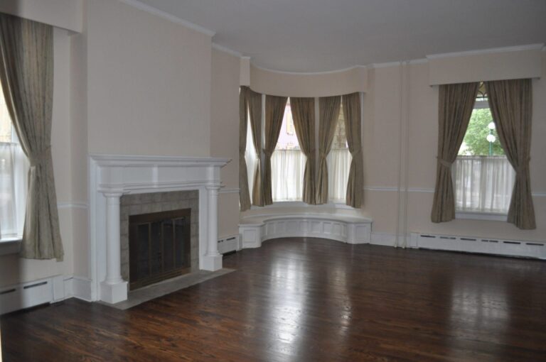 The updated eat-in kitchen offers a cozy dining space, while the living room features a non-working fireplace and a bay window with a seat and draperies. The first bedroom includes two large closets and a ¾ bath with a tiled shower. The second bedroom has a walk-in closet that houses a washer and dryer. A full bath is conveniently located in the hallway just outside the second bedroom.