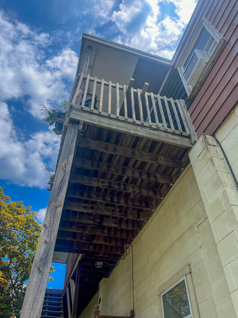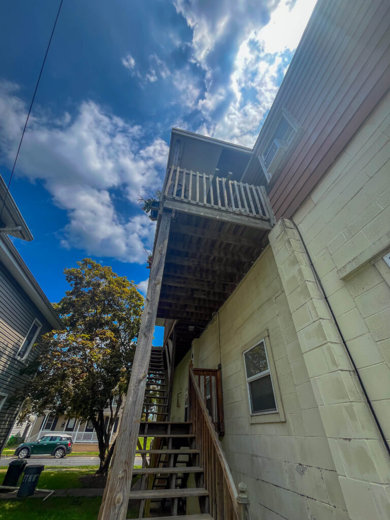 This apartment is within walking distance of Bucknell University and downtown shops. It features a second-floor deck, wood flooring, a kitchen, a living room, a dining area, and a central air and heating mini-split system. A washer and dryer are also included.