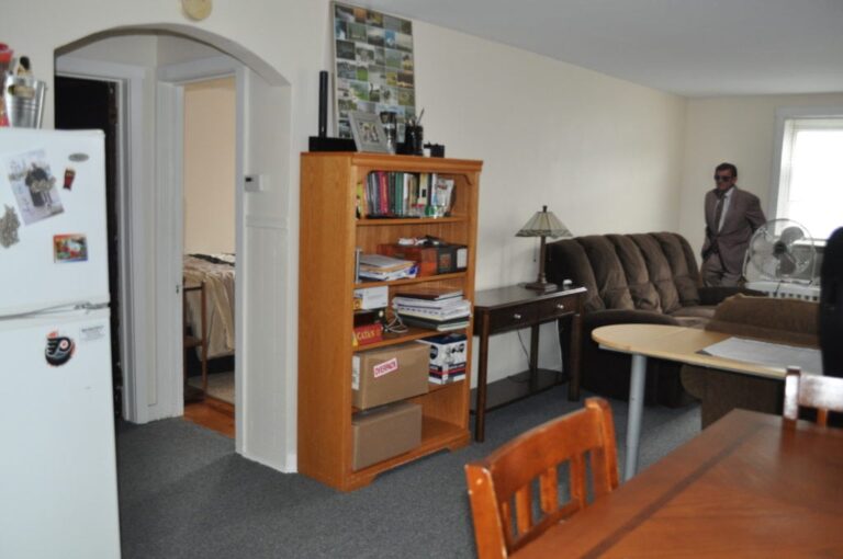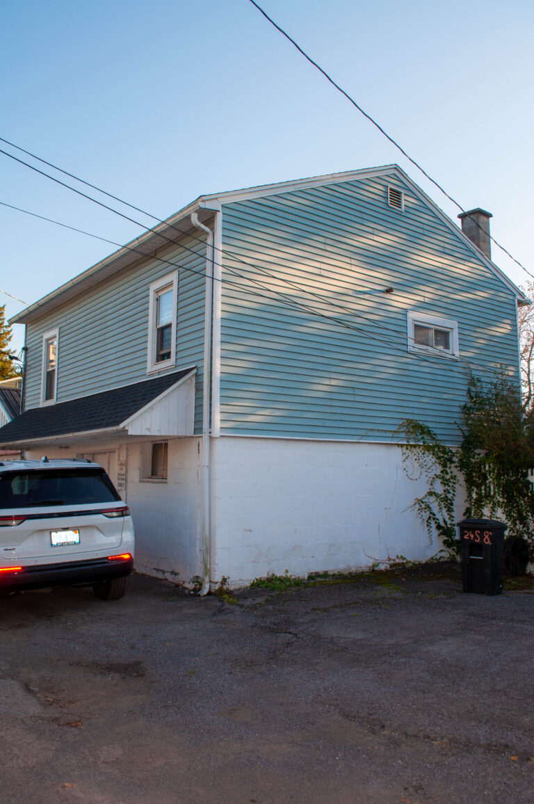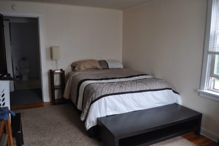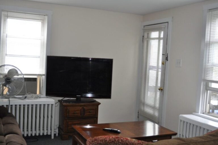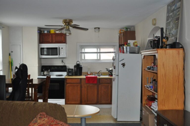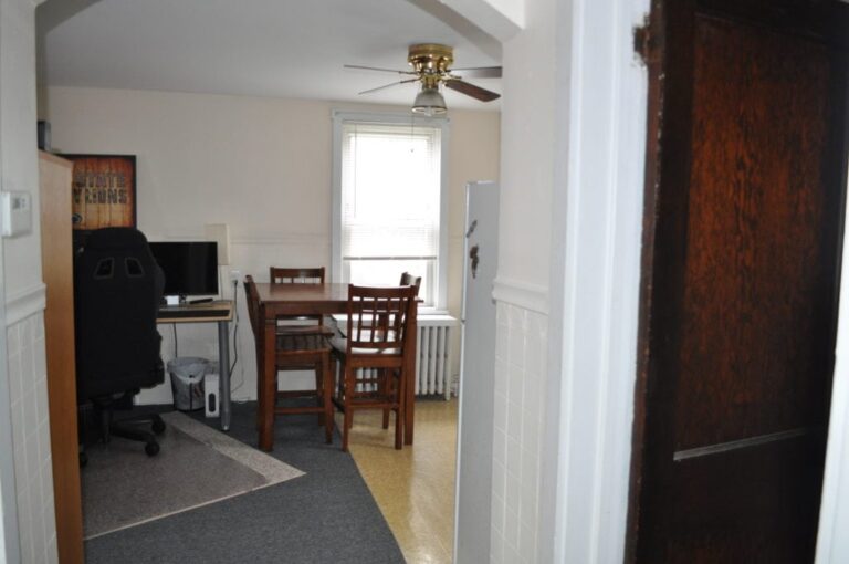 This apartment is located downtown near Bucknell’s campus and the retail area. It features a lawn, second-floor porch, and hardwood floors. The open-concept layout includes a kitchen, dining room, and living room. The first floor also has a laundry area and storage.